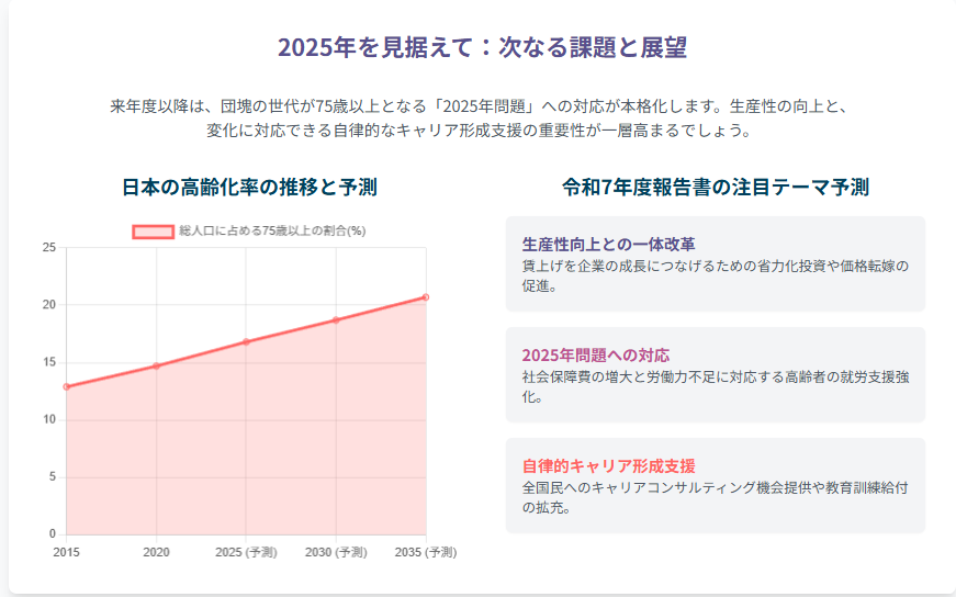 - 変化への適応力を高めるキャリア形成支援:変化の激しい時代において、個人が自律的にキャリアを構築していく必要性がさらに強調されると予測されます。全国民を対象としたキャリアコンサルティング機会の提供や、教育訓練給付金制度の拡充などが議論される可能性があります。