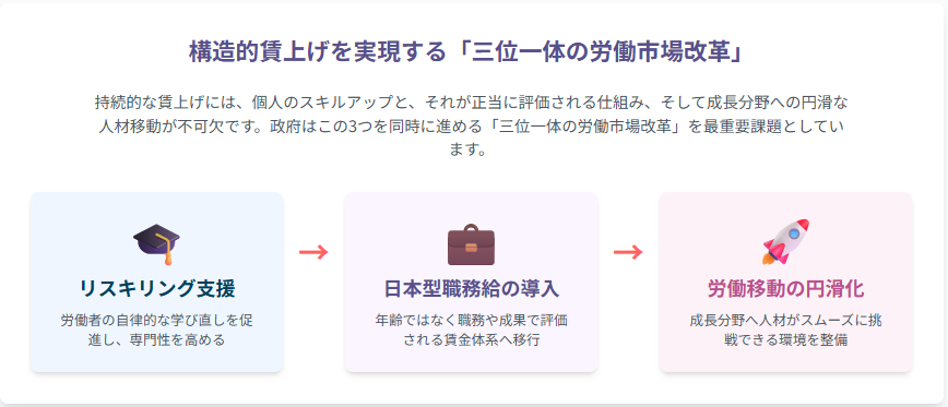 構造的賃上げを実現するため、政府が推進する改革です。以下の3つが柱となります。- リスキリングによる能力向上支援: 労働者の自律的な学び直しを支援し、専門性を高める。